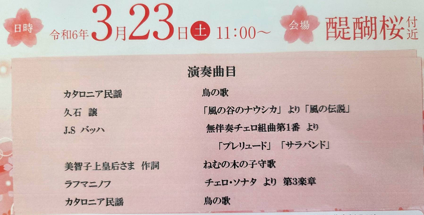 先月初対面の真庭市の太田市長から、2024年の4年ぶりとなる「醍醐桜の桜まつり」でチェロの演奏を依頼されました。
